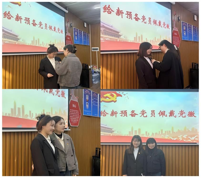 现场,各位入党介绍人为新发展的预备党员佩戴党徽,全体新党员面向党旗庄严宣誓,铮铮誓言彰显着初心使命。新预备党员们分别发言表决心,承诺将以党员标准严格要求自己。